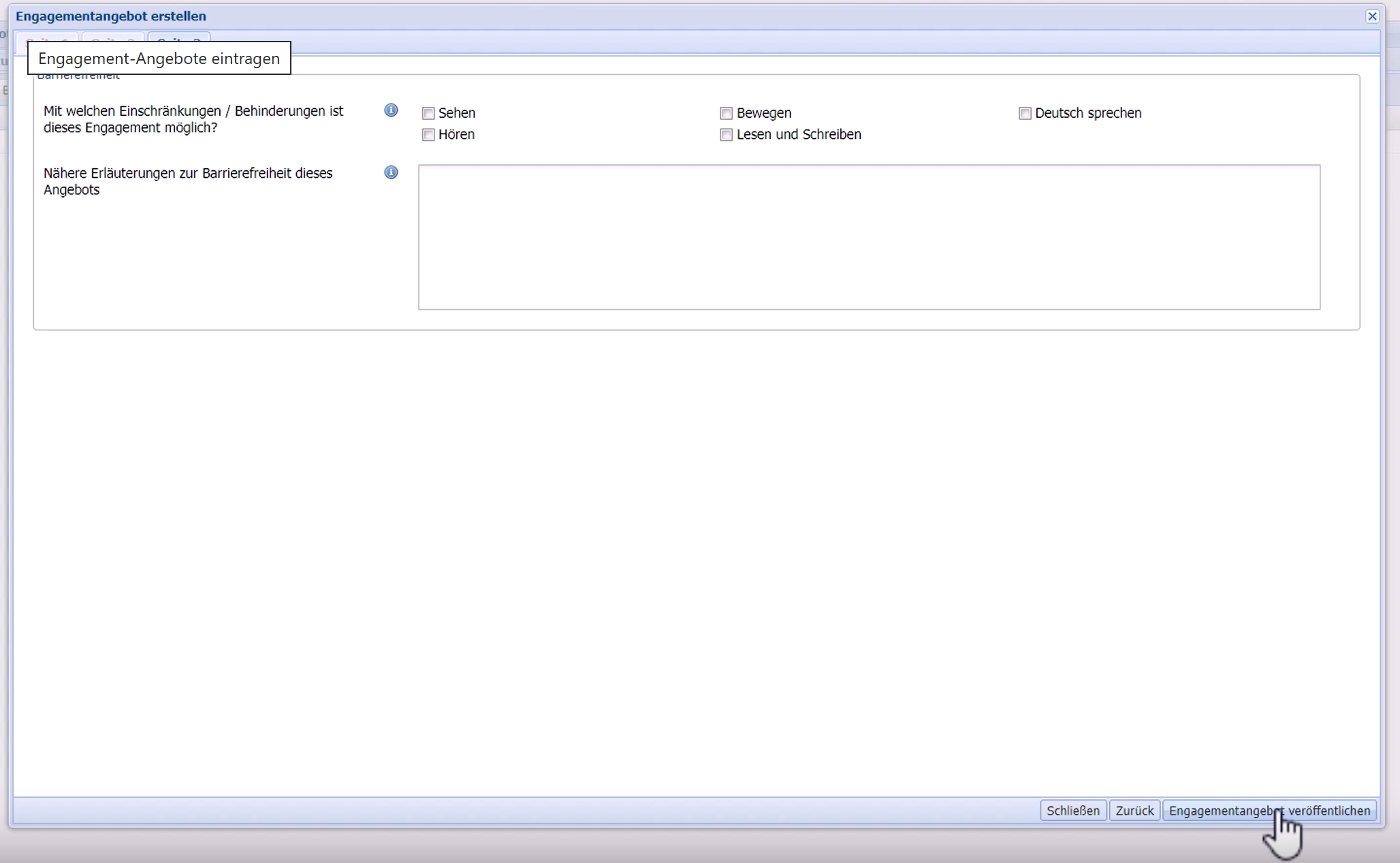 Seite 3: Geben Sie an, für welche Einschränkungen oder Behinderungen das Engagement geeignet ist. Falls nötig, erläutern Sie, welche Maßnahmen zur Barrierefreiheit getroffen wurden.