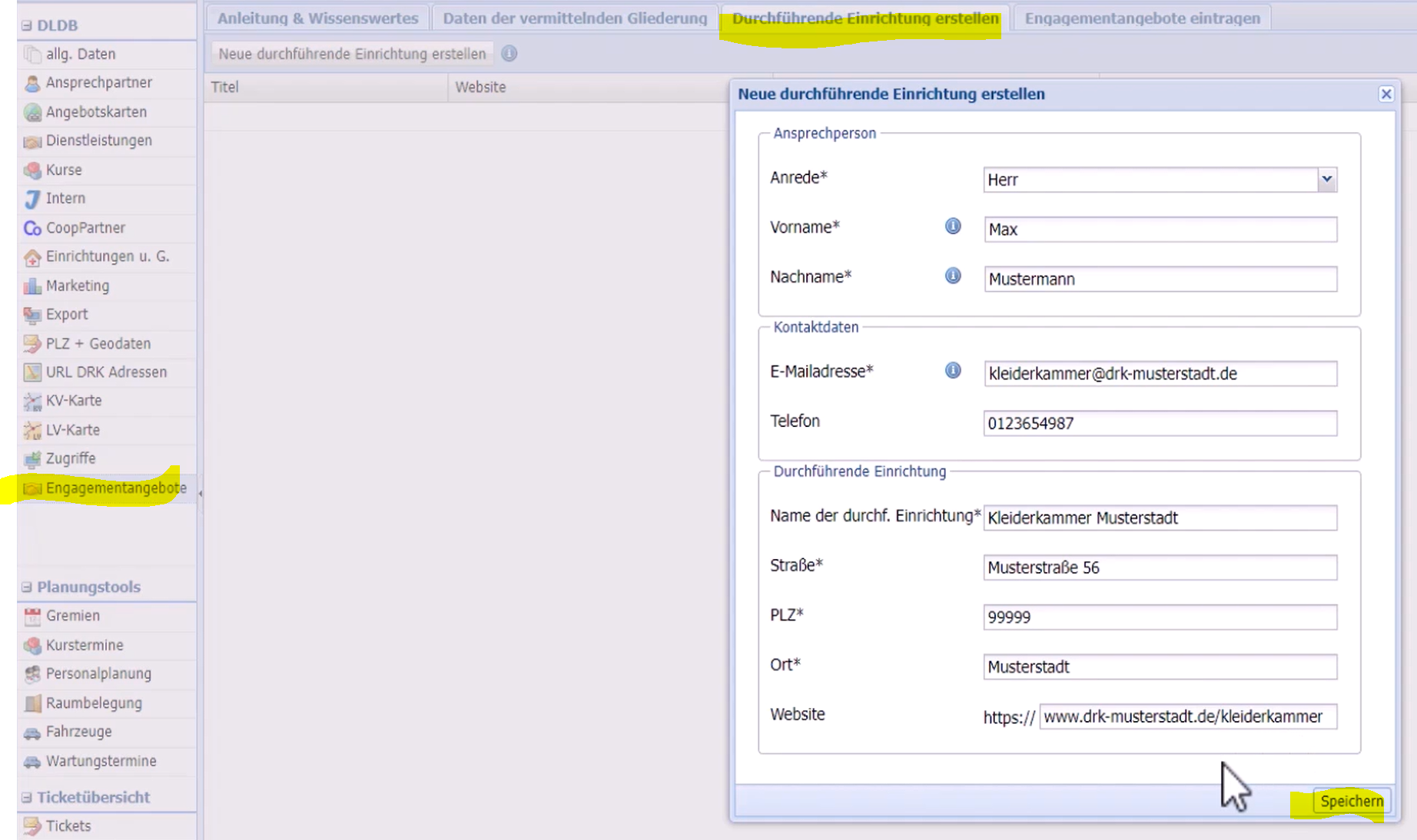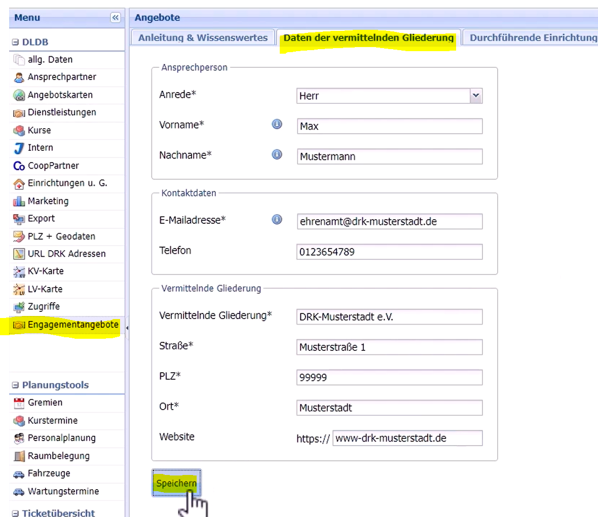 Gehen Sie im Menü der DLDB auf Engagementangebote. Tragen Sie zunächst die Informationen der Organisation ein, die als Vermittler für die Engagementangebote fungiert. In der Regel sind dies die Kreis- und Landesverbände. Achten Sie darauf, dass alle Pflichtfelder (z. B. Name, Kontaktdaten, Webseite der Gliederung etc.) vollständig und korrekt ausgefüllt werden.