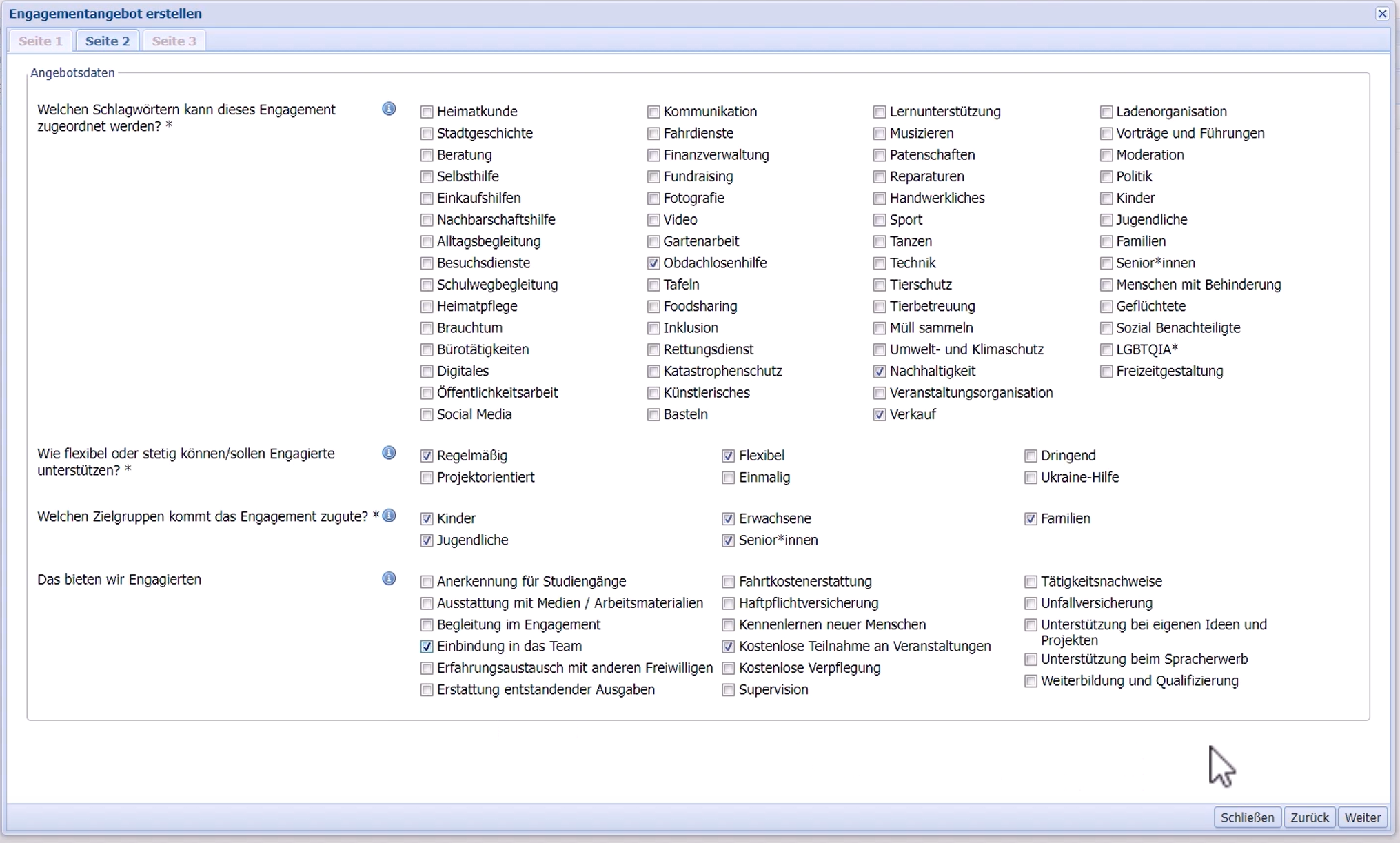 Seite 2: Ordnen Sie das Angebot passenden Kategorien zu, damit es auf Plattformen wie Aktion Mensch, der DRK-Seite und den Landesverbänden gefunden werden kann. Wählen Sie aus, welche Anforderungen an Engagierte gestellt werden, welche Zielgruppen angesprochen werden sollen und welche Vorteile für die Engagierten bestehen.