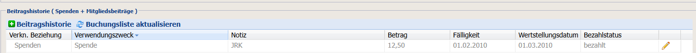 Wird über die Beitragshistorie eine Zahlung zu einer Kundenbeziehung erfasst, die beim Kunden aktuell noch nicht besteht, wird diese automatisch angelegt. Beispiel: Ein Mitglied hat bislang keine Spendenbeziehung. Das im Feld dienstl_datum hinterlegte Datum wird dabei als erste Fälligkeit im Abschnitt Mitgliedsbeziehung > 1. Fälligkeit übernommen. Bitte beachten Sie, dass auf Basis des hinterlegten Abrechnungszeitraums automatisch weitere Fälligkeiten berechnet werden. Entspricht das Datum dem aktuellen Tagesdatum, wird zusätzlich – gemäß der Systemlogik zur Ermittlung offener Zahlungen – ein offener Posten in der Beitragshistorie erzeugt. Dies kann dazu führen, dass der Betrag doppelt in der Beitragshistorie erscheint: