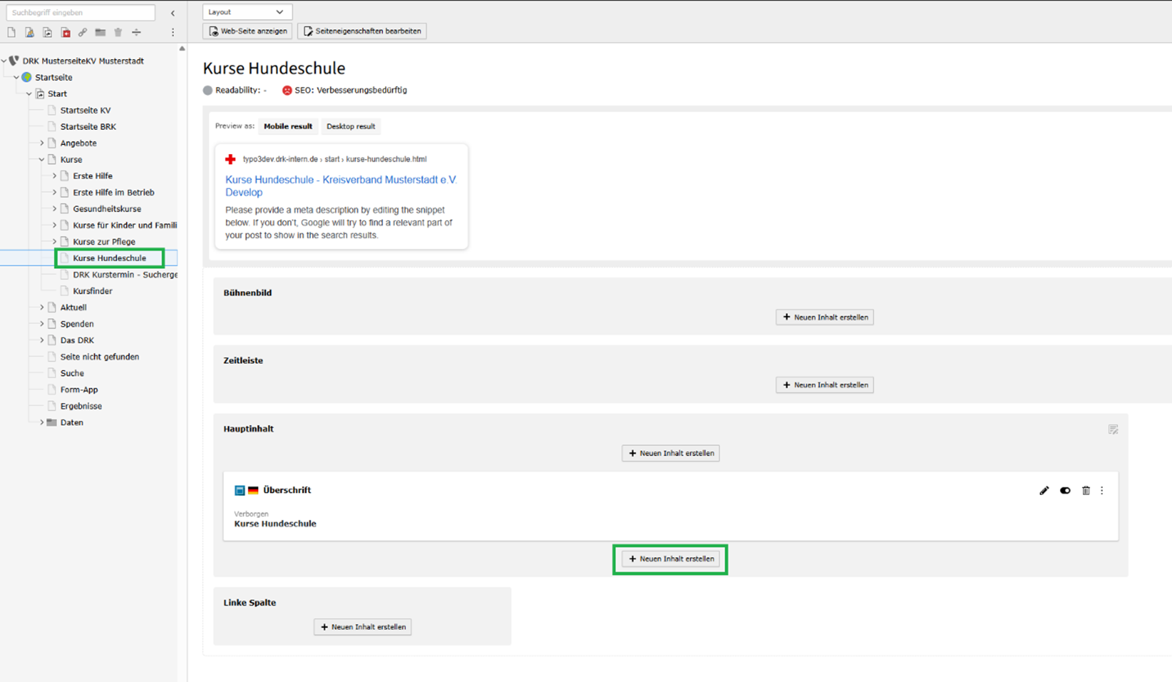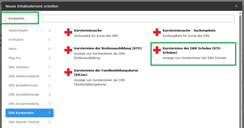 - Fügen Sie ein neues Inhaltselement hinzu und wählen Sie „Kurstermine der DRK-Schulen (KTV-Schulen)“.