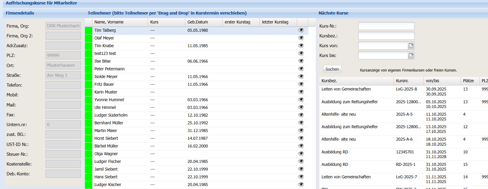 Es werden die bestehenden Mitarbeitenden aufgelistet. Über das Auge am Ende des Datensatzes können Sie sich Details zu dem ausgewählten Teilnehmenden ansehen, inklusive der gebuchten Kurse. Die Spalten erster Kurstag und letzter Kurstag bleiben stets leer.