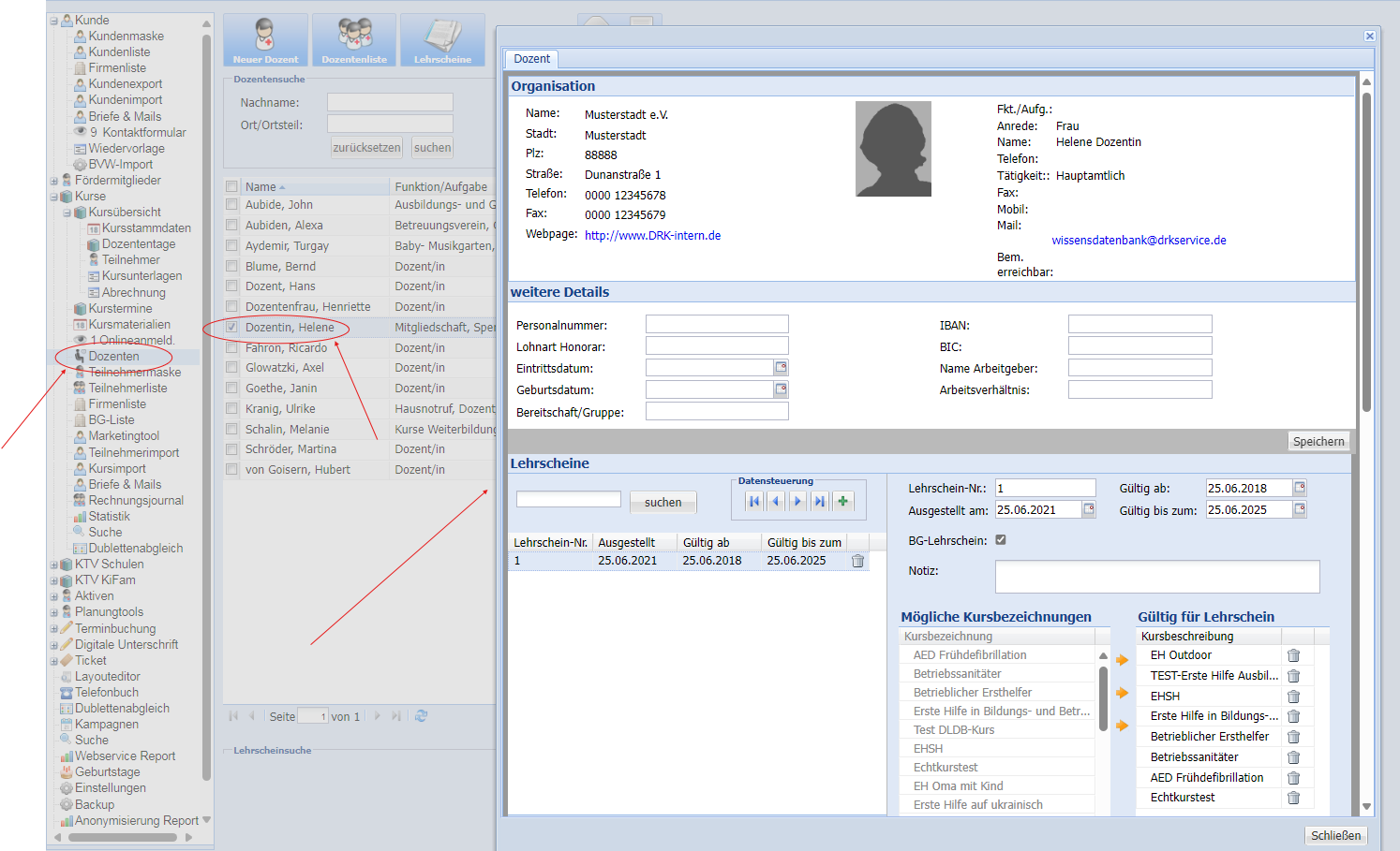 Klicken Sie einen Dozenten zur weiteren Bearbeitung der Lehrscheine und weiterer Angaben an.