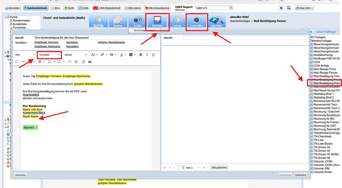 Das Anschreiben zur Kursbestätigung können Sie im Email-Editor bearbeiten.