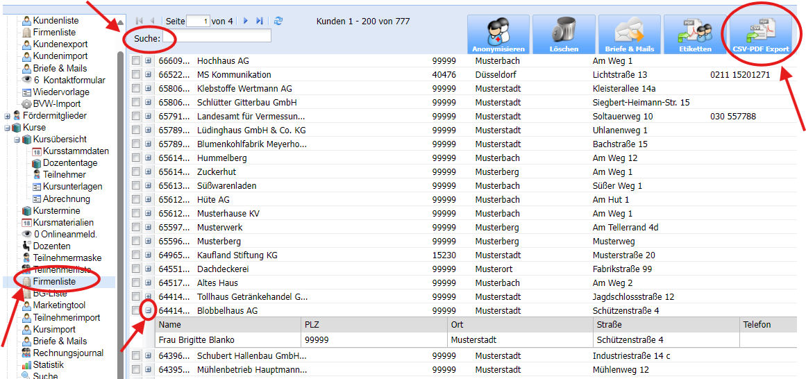 Darüber hinaus können einzelne oder mehrere Firmen ausgewählt werden, um z.B. Serienbriefe zu erstellen.