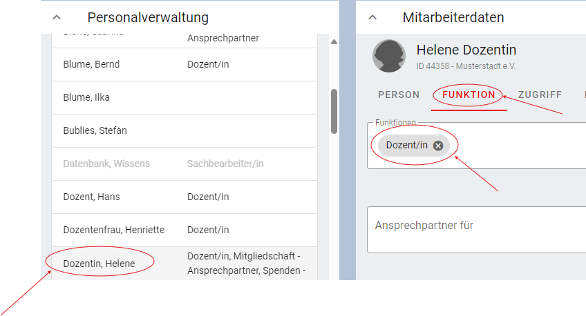 Ergänzen Sie die Funktion des Mitarbeitenden/Dozent. Bei Dozenten muss die Funktion „Dozent“ in der BVw hinterlegt werden, damit diese als Dozenten in der KTV angezeigt und bearbeitet werden können. Die Speicherung erfolgt automatisch.