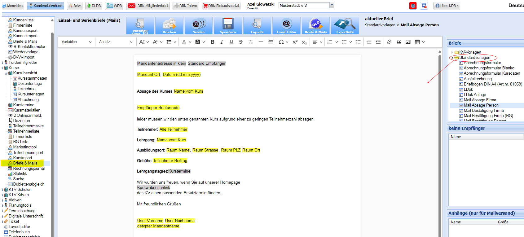 Unter "Briefe & Mails" -> Standardvorlagen stehen Ihnen diverse relevante Vorlagen zur Verfügung, welche Sie auch Ihren Vorstellungen/Vorgaben entsprechend anpassen können.