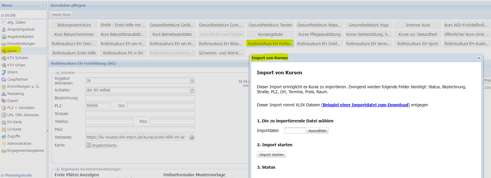 Löschen Sie alle Kurse die ggf. über die Schnittstelle bisher in der KTV angelegt wurden. Sie können im Anschluss die Kurstermine in der DLDB einzeln anlegen oder alternativ den Kursterminimport "Import von Kursen" nutzen. Für den Kursimport steht eine Beispieldatei als Excel-Datei zur Verfügung.