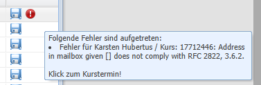 Kann eine Mail nicht versendet werden, so erscheint hinter dem Diskettensymbol zum Download ein roter Kreis mit einem weißen Ausrufezeichen. Sie können darauf klicken und erhalten eine Auflistung mit dem Namen, der KursID sowie den Hinweis zum Fehler. Die KursID ermöglicht den direkten Wechsel in den betroffenen Kurstermin, um die Mail erneut auszulösen.