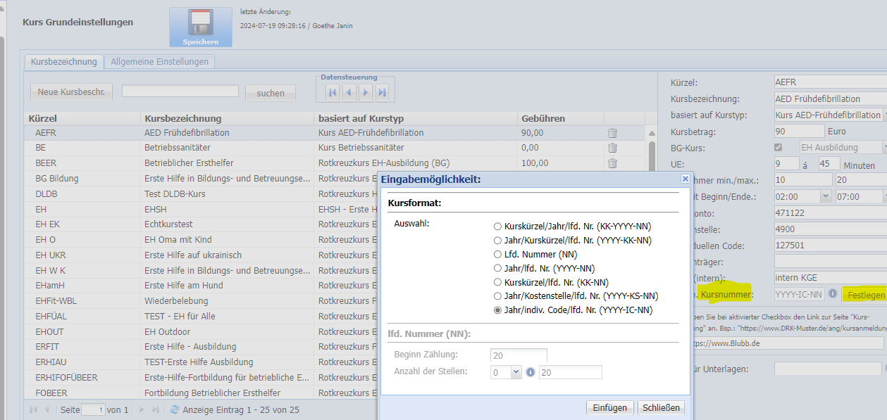Die Anzeige, wie Ihre Kursnummer vergeben wird, kann individuell zu voreingestellteneingestellten Varianten angelegt werden (Kurskürzel/Jahr/lfd. Nr. oder Jahr/Kurskürzel/lfd. Nr. oder lfd. Nummer oder Jahr/lfd. Nr. oder Kurskürzel/lfd. Nr.).