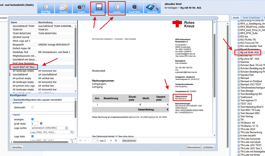 Anschließend können Sie dann das Layout mit Ihren Mailvorlagen zusammenführen/verknüpfen.