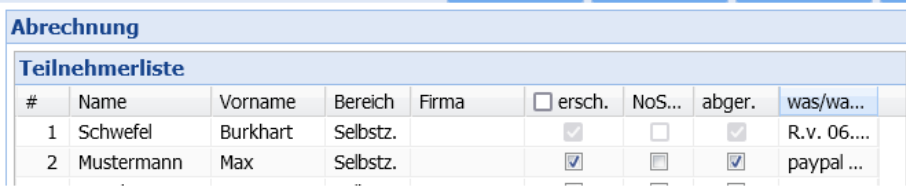 Wird eine Onlineanmeldung, die über den Zahlungsdienst PayPal abgeschlossen wurde an die Kursteilnahmeverwaltung übergeben und übernommen, so wird im Kurstermin > Abrechnung > Teilnehmerliste der Status der Zahlung automatisch auf „bezahlt“ gesetzt.
