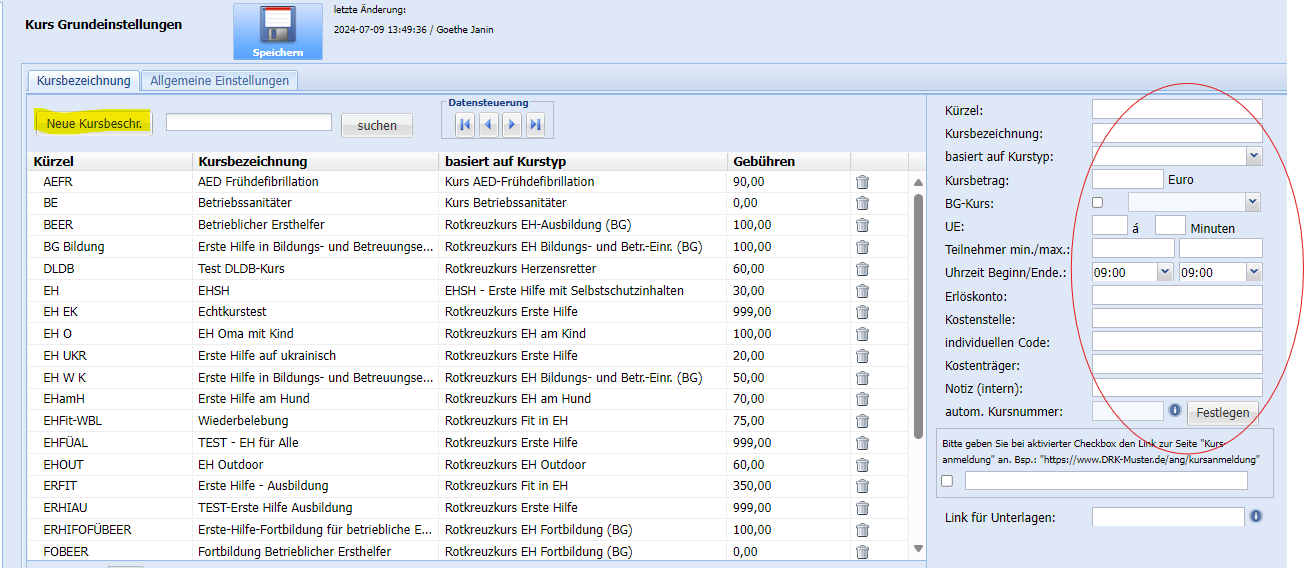 Änderungen in den Kursgrundeinstellungen werden für neue Kurstermine herangezogen und nicht automatisch für bereits bestehende Kurstermine übernommen.
