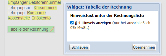 Der unterhalb der Rechnungstabelle fest hinterlegte Hinweistext kann bei Bedarf über das Stiftsymbol im Widget „Tabelle zur Rechnung“ ausgeblendet werden.