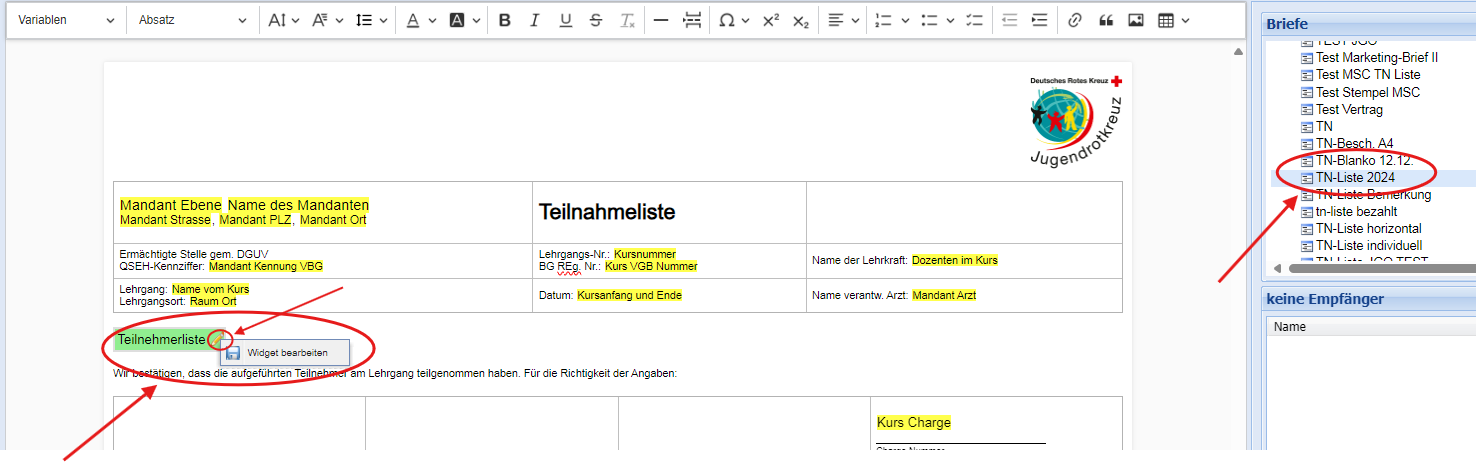 In der Briefvorlage „TN-Liste“ können Sie mithilfe des Widgets „Teilnehmerliste“ die angezeigten Spalten individuell auswählen, umbenennen und anordnen..