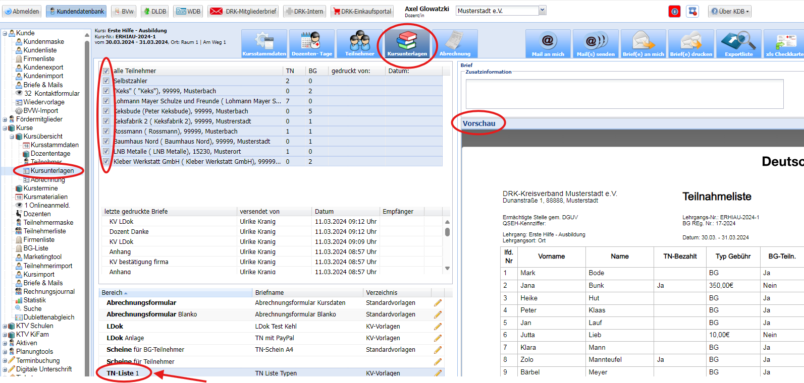 Änderungen prüfen: Öffnen Sie einen Kurstermin und wählen Sie den Bereich „Kursunterlagen → Vorlagen“.  Wählen Sie Ihre angepasste TN-Listen-Vorlage aus.  Überprüfen Sie das Ergebnis mithilfe der Vorschau und Echtdaten.