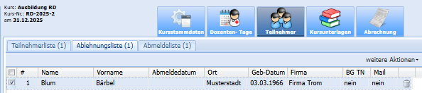 Sie haben die Möglichkeit, einzelne Datensätze im Onlinebereich abzulehnen. Um einen Datensatz abzulehnen, öffnen Sie die Ansicht im Onlinebereich und setzen die Checkbox in der Spalte "Ablehnung". Übernehme Sie die Daten wie gewohnt in das System. Abgelehnte Datensätze werden in dem Kurs auf einer Ablehnungsliste angezeigt und bleiben somit zur Nachverfolgung sichtbar.