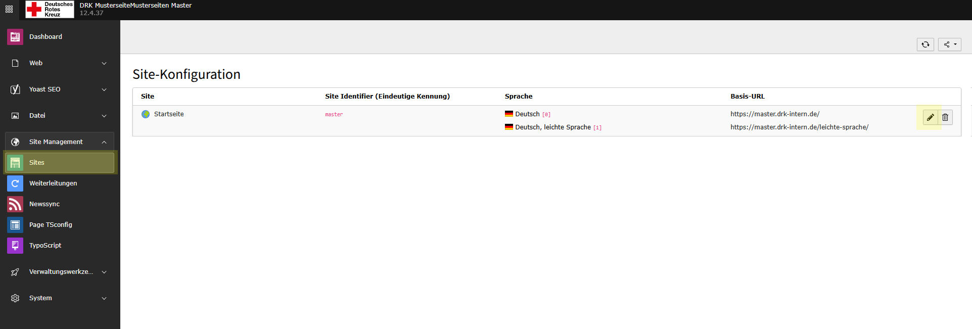 Abbildung 1: Sites → Bearbeiten (Stift)