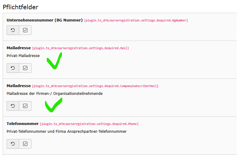Die Option dafür ist im Backend im Abschnitt Pflichtfelder: TypoScript à Startseite (Weltkugel) à Konstanten-Editor à Onlinekursanmeldung.
