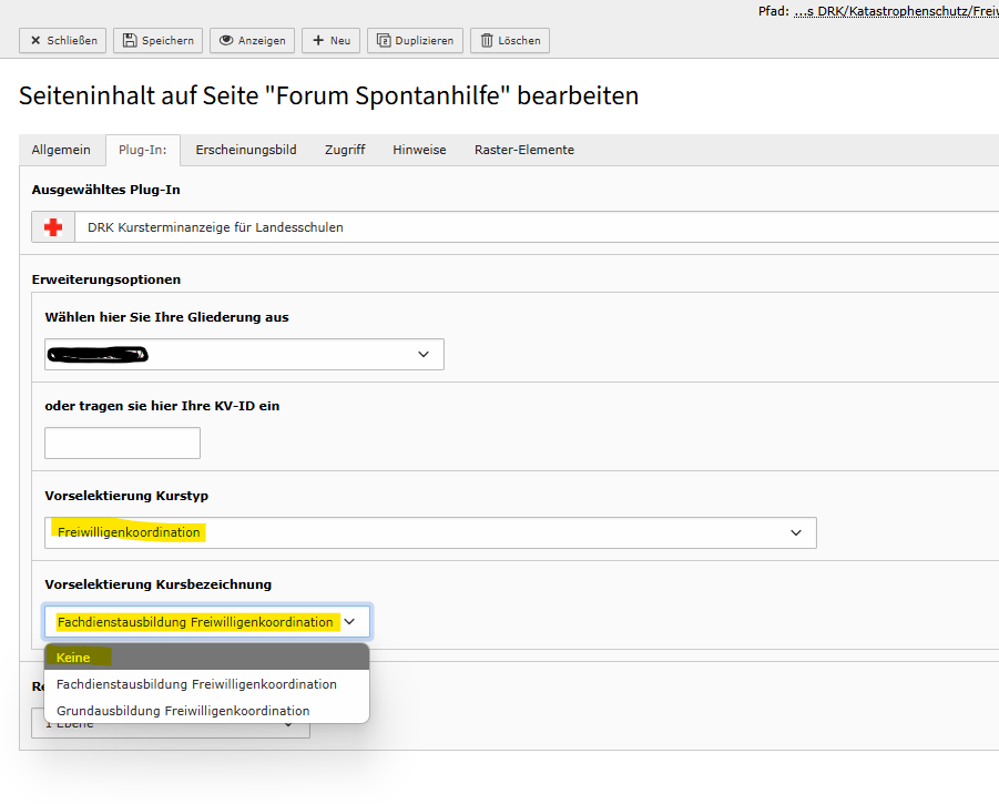 Unter "Vorselektierung Kursbezeichnung" fehlen in der Kursverwaltung angelegte Kursbezeichnungen des ausgewählten Kurstyps.